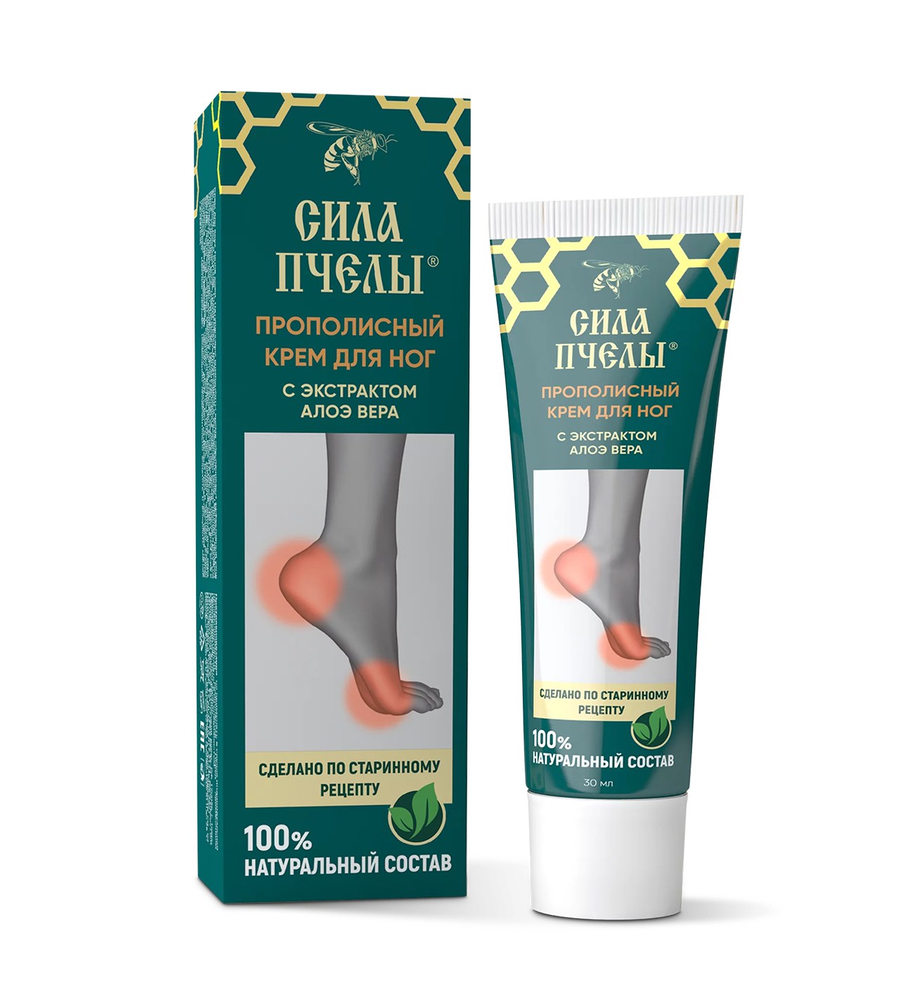 Малҳами прополис барои пойҳо,кафхои пой кафиши пойхо. Маҳсулоти намноккунанда ва барқароркунандаи "Қувваи занбӯри асал" бо экстракт алоэ. Компонентҳои табиии равғани атрафшон нигоҳубини муассир барои пӯсти пойҳо ва буғумҳоро таъмин мекунанд.